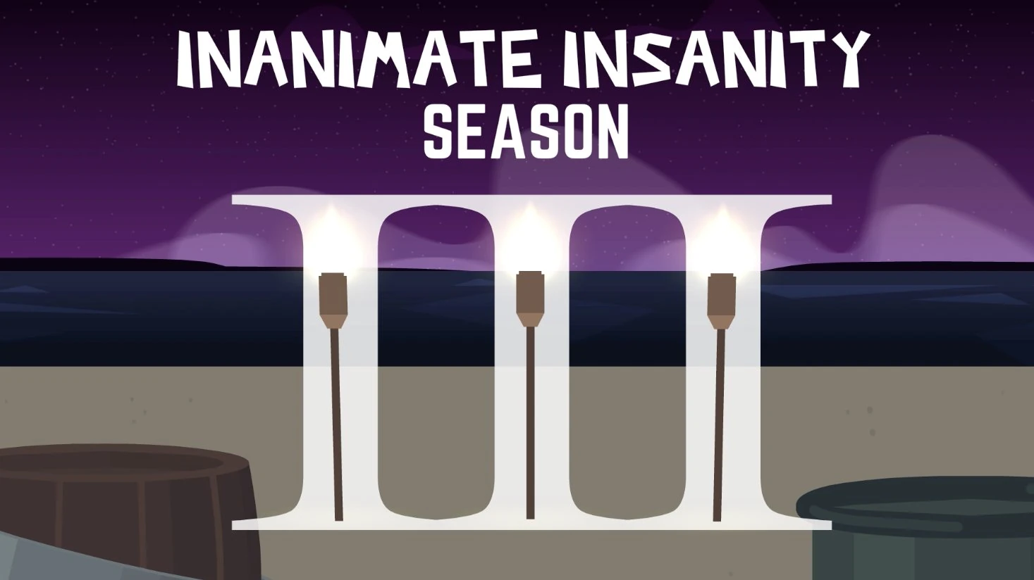 The screen pans to a night sky, panning down onto a beach with three tiki poles. Text slowly appears, revealing that Inanimate Insanity Season 3 would be releasing on April 3rd.