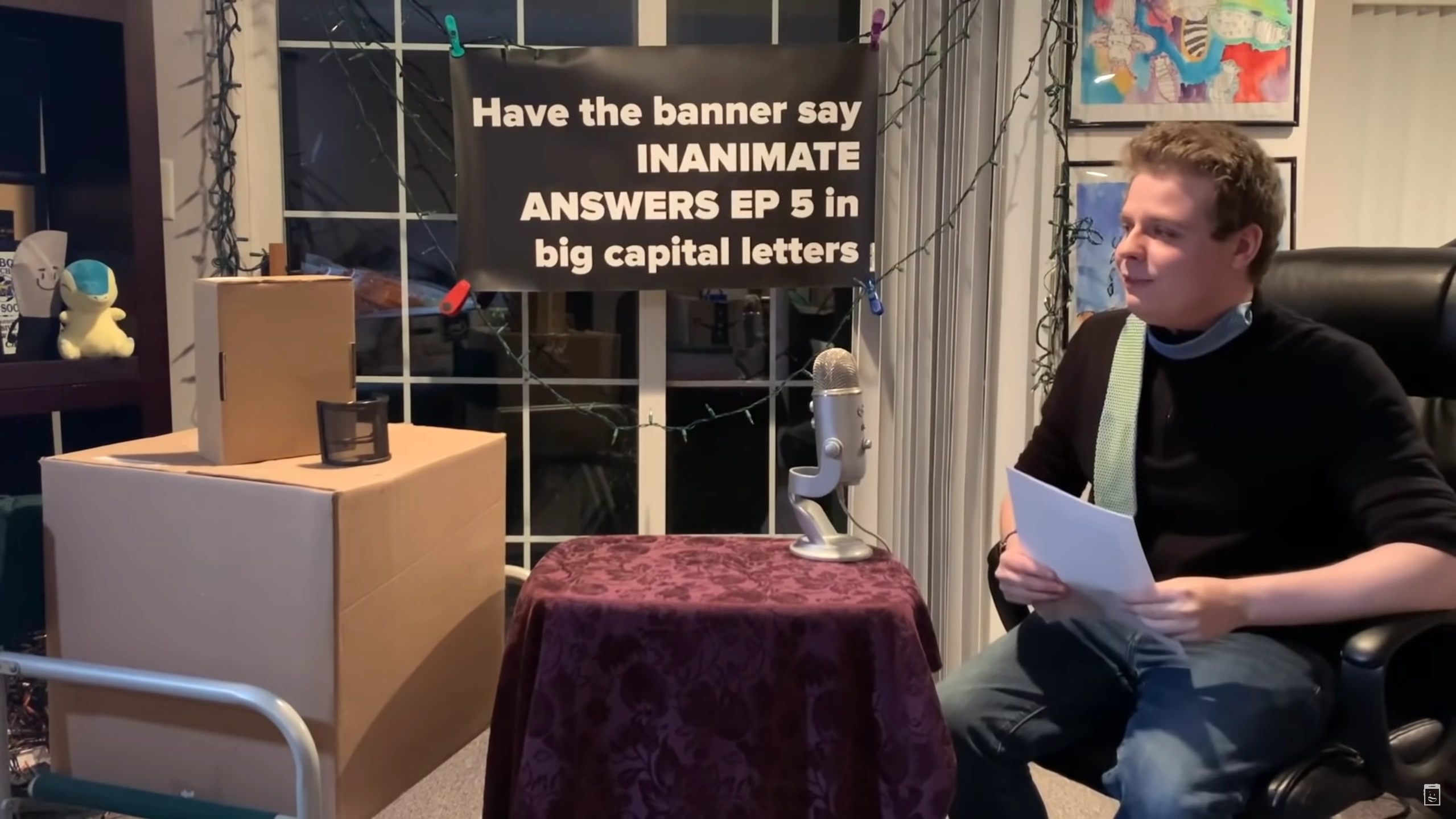 Justin Chapman welcomes the viewers to Inanimate Answers, where they would be interviewing Box. Justin asks Box how he was doing, and gets no response. Justin then gets on their knees and pulls out a ring box with a Steven Universe pin in it, and asks Box if he would answer Patreon questions with them. Box "says" yes. Justin begins to ask Box a Patreon question when Box's phone rings. Justin is told that Box had to go somewhere, which makes them upset. Justin decides to read the question anyway (from Casey Helton) which cuts to a video recording of Justin asking Casey via Discord call to say, awkwardly, "What's up with the Inanimate Insanity Patreon?".