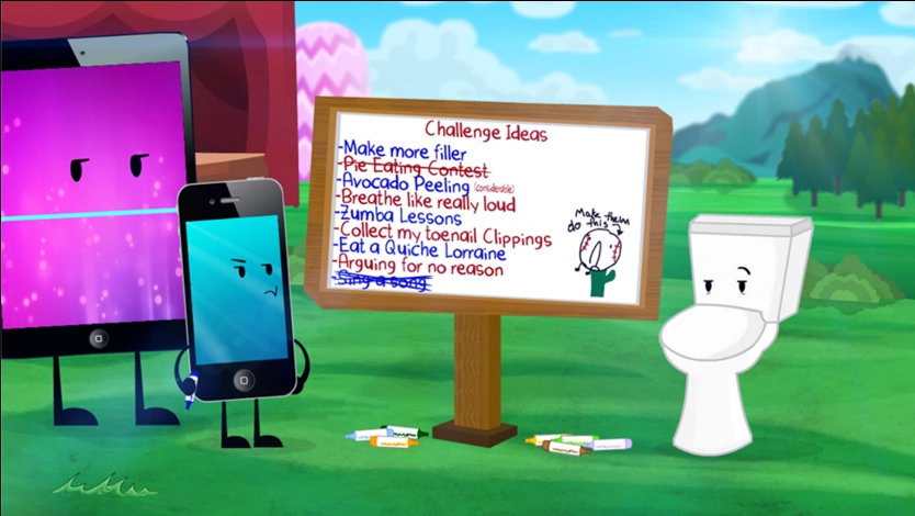 Back to where the last episode left us, MePhone4, Toilet and MePad is staring at the Challenge Ideas board, trying to think of a low-key challenge. MePhone4 comments that deciding on an idea is really tough. Toilet interrupted, saying that you'd think that coming up with an easy challenge