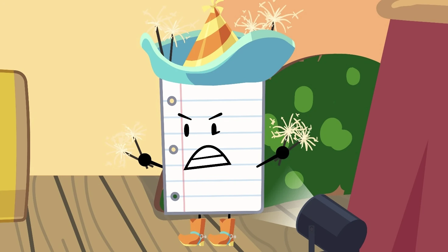 Paper appears next to OJ, greeting Knife and Suitcase into the Hotel OJ Party, and mentions that he likes to call it "HOP." Knife points out the acronym mistake, which leads to OJ and Paper arguing about it. After hearing the wailing, Paper tells Fan that they had a Spoiled Lemon reunion planned out. Paper is then seen making party hats before OJ walks in and suggests a new idea for the hats. Paper is visibly upset at the idea of OJ making everything about himself and lashes out at him. He notices OJ going silent and grows worried when he starts panicking after having to face MephoneX. After being attacked, he yells in horror with everyone else upon seeing OJ's state. Paper is later seen grieving next to OJ's fallen figure.