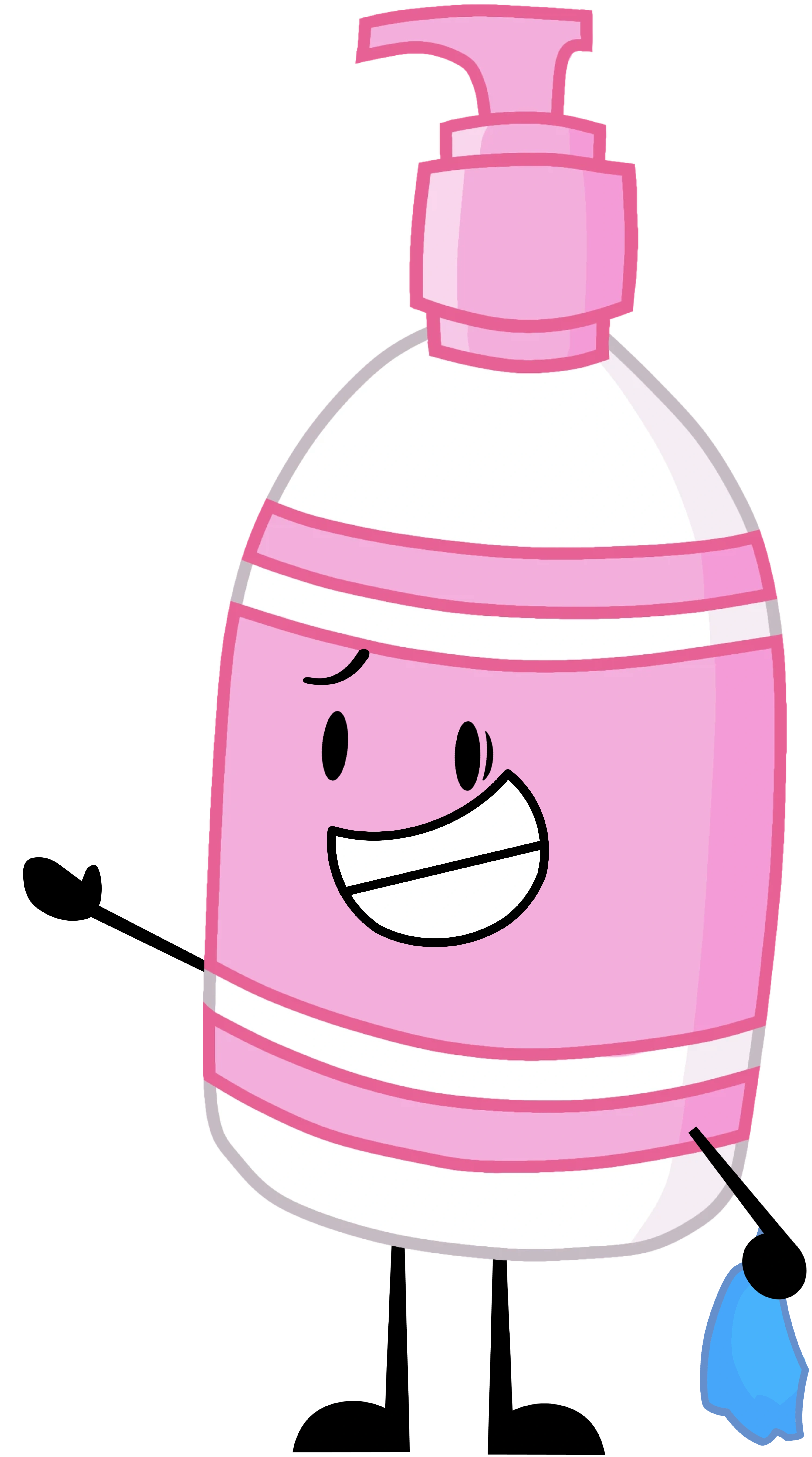 Soap is a white round soap bottle with a face inside a square pink label with pink horizontal stripes above and below. On her head is a pink cap with a pink pump. Her arms are on the sides and her legs are at the bottom of the bottle.