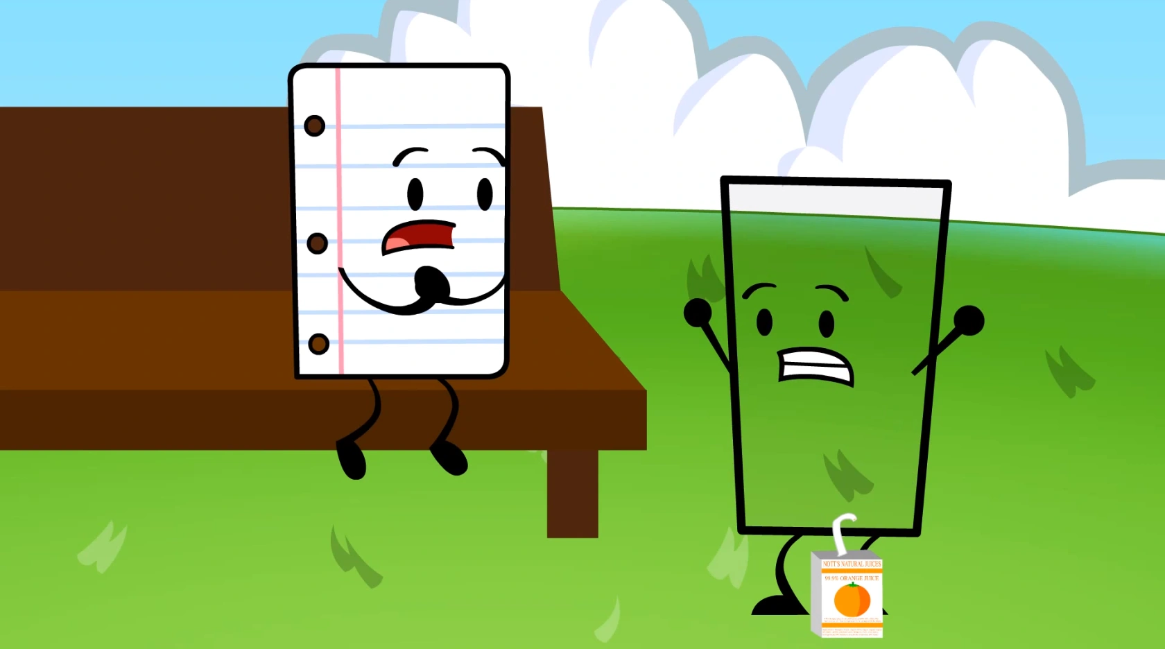 The first episode after the hiatus kicks off with Paper sitting on a bench with OJ (noticeably still without his orange juice) laying next to him. Paper laments the tragic nature of his possible elimination, and questions how anyone could vote him out as opposed to Bow. OJ groans in response and Paper tells him to quit complaining. OJ angrily straightens up and yells at Paper how sick he is without his orange juice, while Paper picks up a container of orange juice from the ground.
